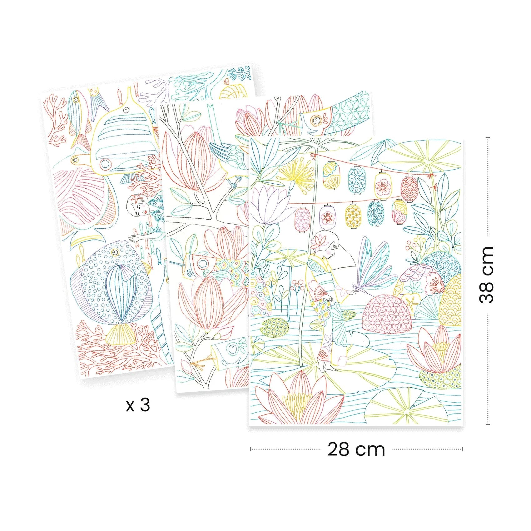 Introducing a beautiful collection of Japanese inspired colouring sheets presented as a portfolio. Unleash creativity with this set of 3 large and intricate pictures to be coloured in each pocket. Whether you’re a kid or an adult, this range is perfect for everyone who loves to colour.