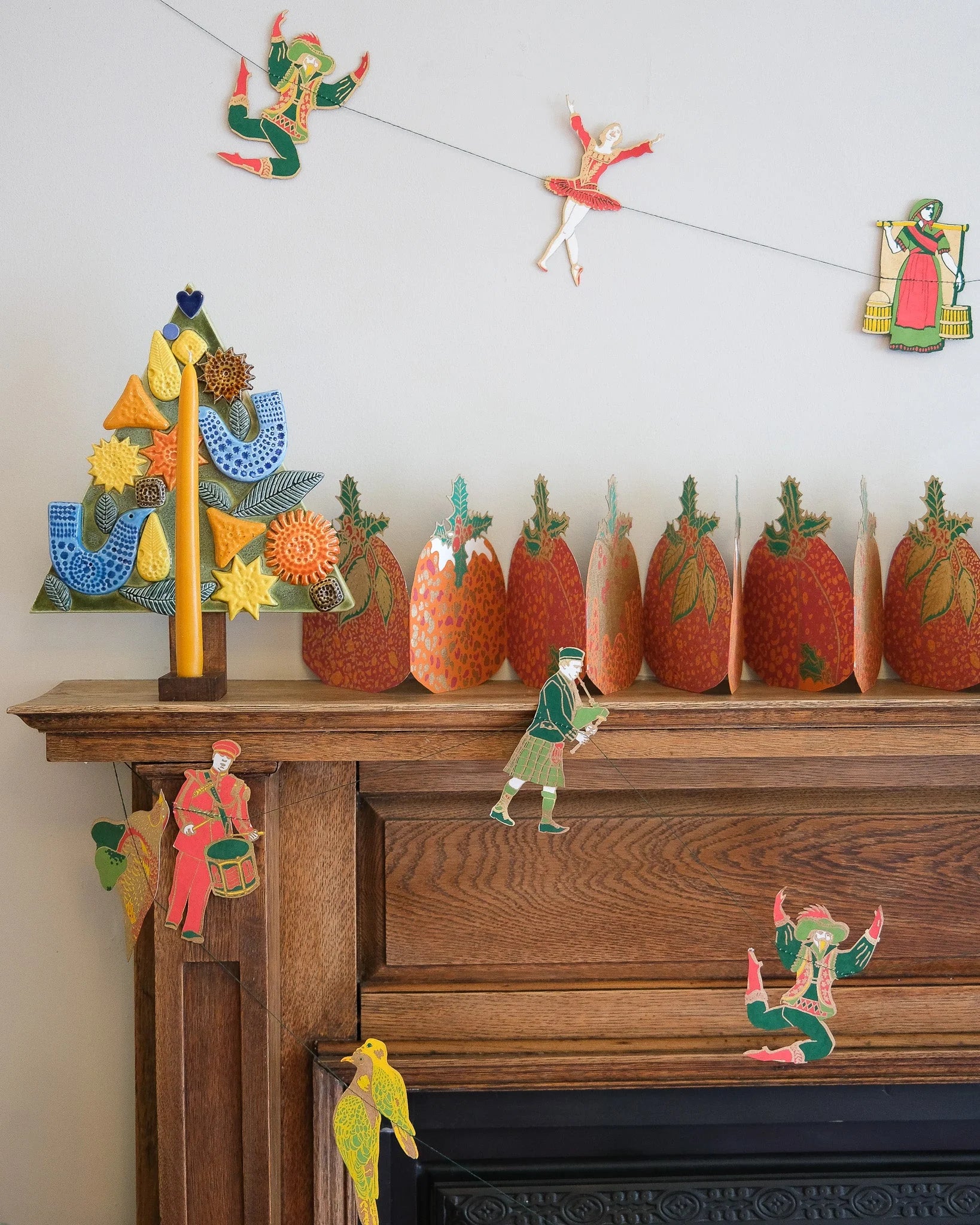 This garland illustrates the twelve gifts of the classic English carol, The Twelve Days of Christmas.