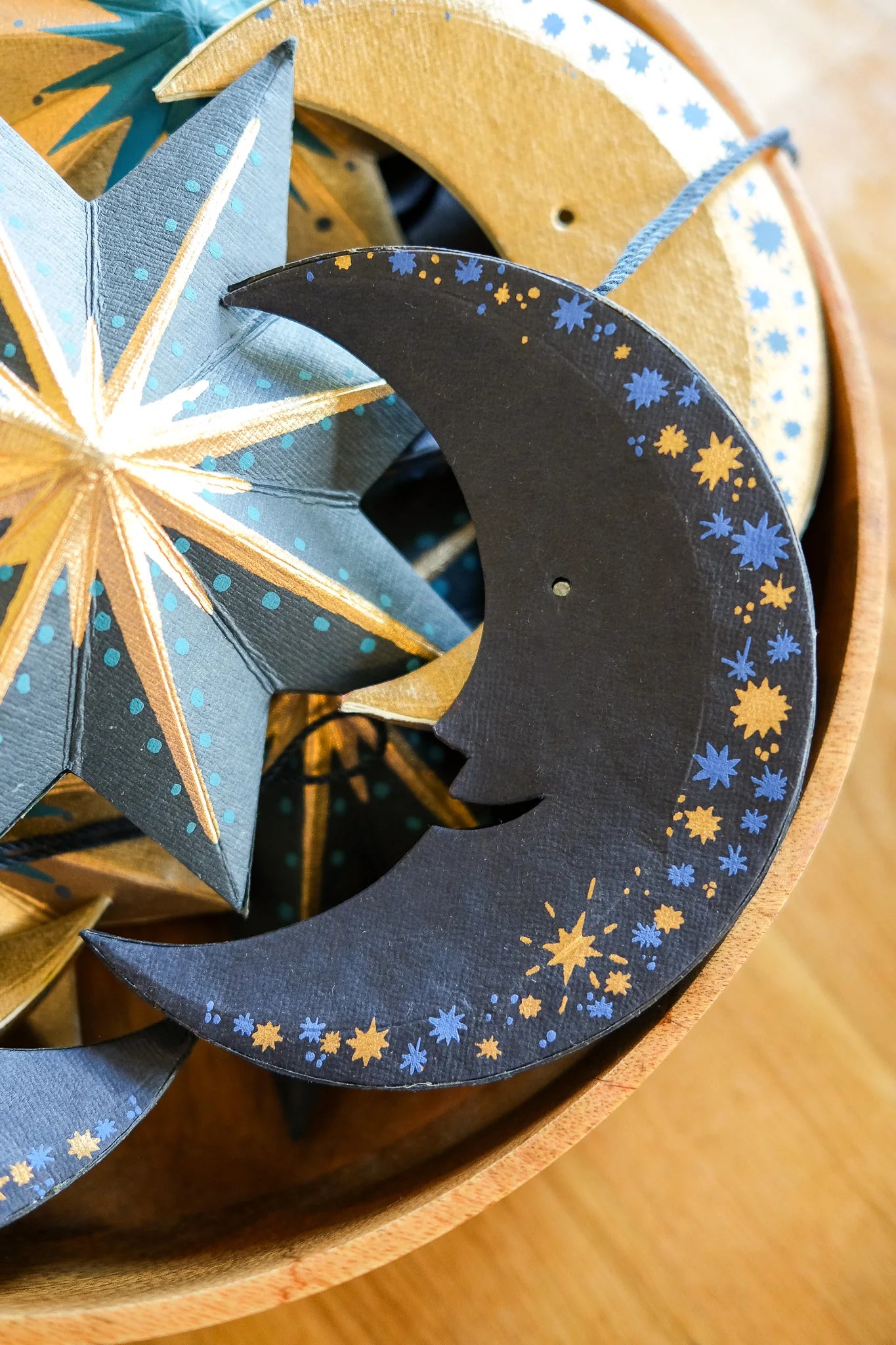 - Screen printed board ornament, sustainably made from 100% recycled paper.